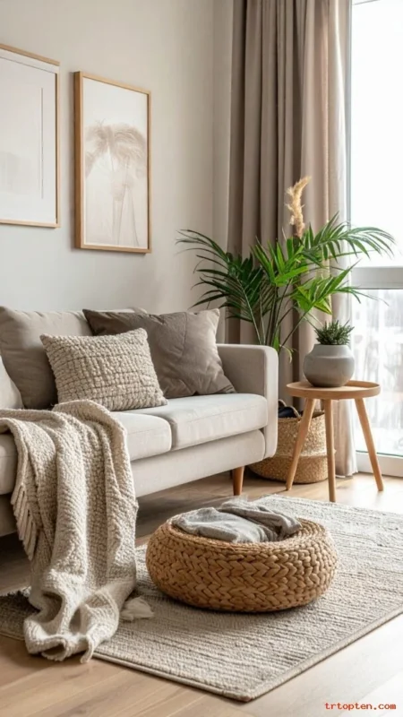Use a woven seagrass basket for a natural look. Place it near the sofa so you can grab blankets easily. Fill it with two throws and one extra pillow. This setup makes the room look ready for guests.