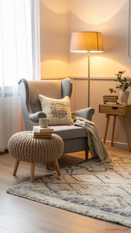 Place a floor lamp behind or beside the chair for focused reading light. Add a small ottoman or pouf so you can put your feet up. Finish the corner with a throw blanket and a small plant. This corner becomes a daily comfort spot fast.