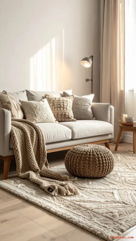 Mix a velvet pillow, a woven pillow, and a faux fur pillow for a cozy trio. This texture blend adds depth without needing loud colors.