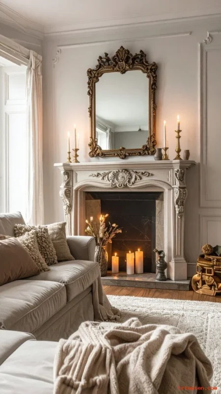 Add a large mirror or framed art above the mantel. Place simple decor like candlesticks, a vase, and a small stack of books. Keep the styling balanced but not perfectly symmetrical. This gives a relaxed and welcoming look.