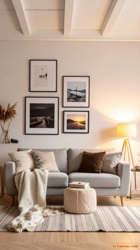 Use matching frames in black, wood, or white. Mix family photos with simple line art for balance. Lay out the frames on the floor first to plan spacing. Hang them with even gaps for a tidy finish.