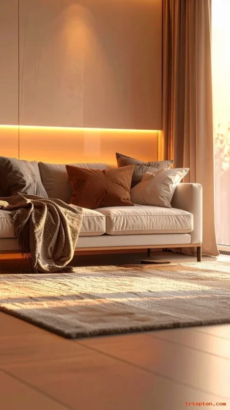 Add LED strip lights under shelves, behind a TV console, or inside a bookcase. Choose warm white settings, not cool daylight. Hide cords and keep placement neat. Turn the lights on in the evening for a calm mood shift.