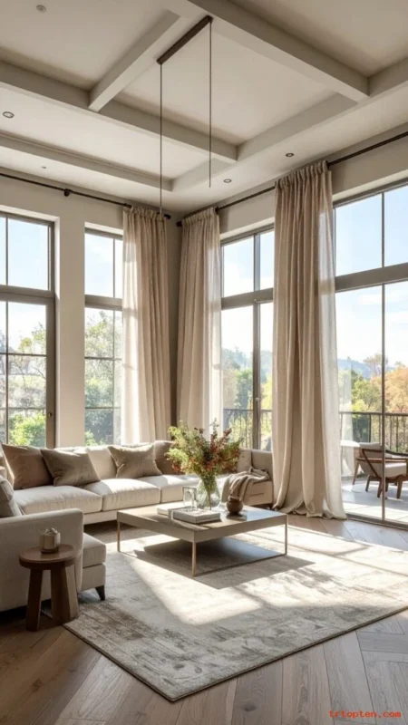 Choose linen or linen-look panels for a relaxed texture. Use warm whites, oatmeal, or soft taupe for a cozy glow. Let curtains kiss the floor for a calm finish. This detail makes the room look finished and comfortable.