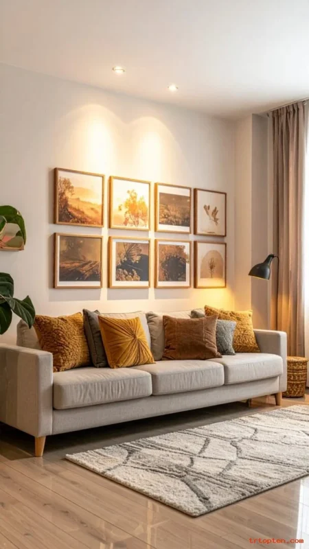 Choose prints with terracotta, beige, soft brown, and muted blush. Use matte frames in wood or black for clean edges. Hang art at eye level above the sofa for a grounded look. Group smaller prints in a simple grid for order.