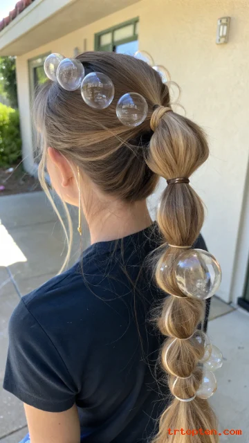 Tie your hair into a mid ponytail. Add elastics every few inches down the ponytail. Gently pull each section to create rounded bubbles.