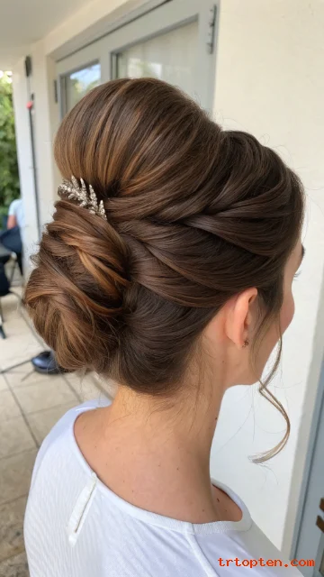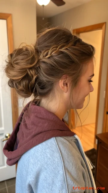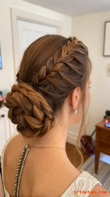 This bun feels special but stays practical. Thick hair makes the braid and bun look full. It is great for weddings, dinners, and long workdays.