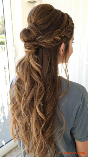 A half-up ponytail keeps hair off your face. It keeps thick hair looking full but controlled. It is a good style for medium to long hair.
