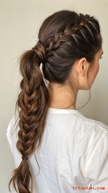 A low braided ponytail is easy and tidy. Thick hair makes the braid look bold and full. It is great for travel and long days.