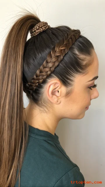 Create a mid or high ponytail. Take a small section from the ponytail and braid it. Wrap the braid around the base and pin it underneath.