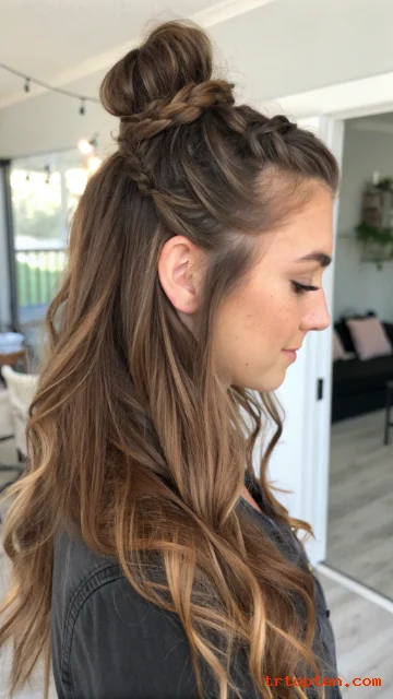 A half-up top knot takes weight off your face. It keeps thick hair controlled while leaving length down. It looks trendy and works on many hair lengths.
