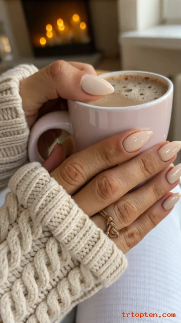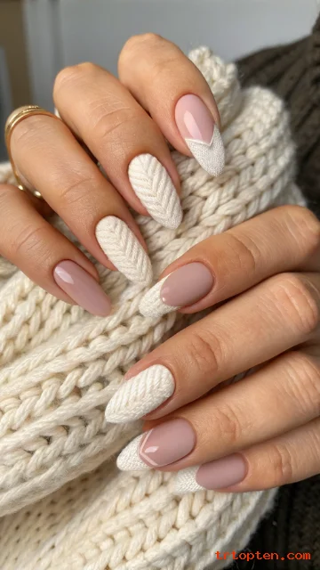 Use a soft cream, muted taupe, or dusty rose base for all nails. On a few nails, build raised sweater patterns with gel in the same shade and cure in layers.