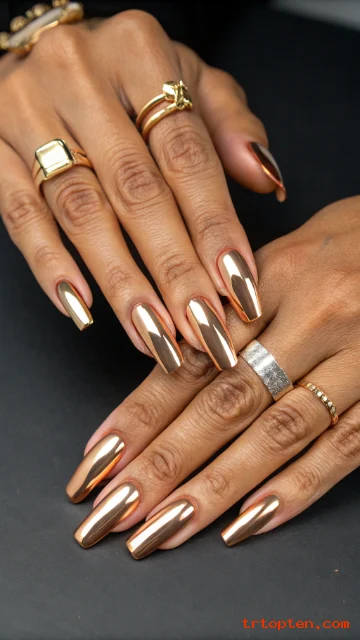 Metallic bronze chrome nails look like melted metal in warm autumn tones. The finish catches light in a bold, reflective way.