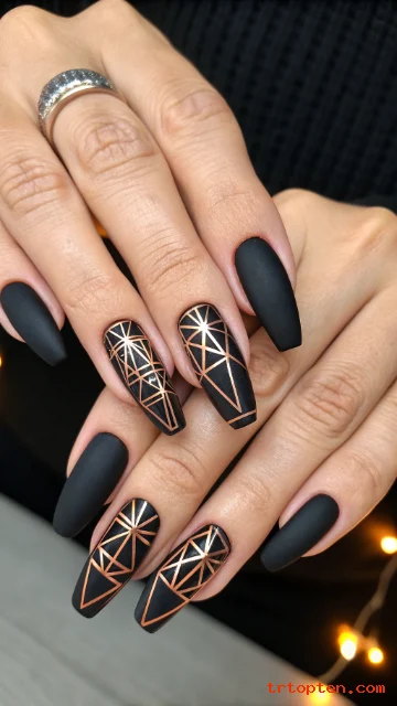 Matte black nails with copper lines feel sharp and modern with a clear fall edge. The warm metallic lines glow against the dark base.