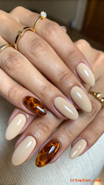 Paint most nails in a neutral nude that matches your skin tone. On one or two nails, create a tortoiseshell pattern with translucent amber, brown, and black spots.