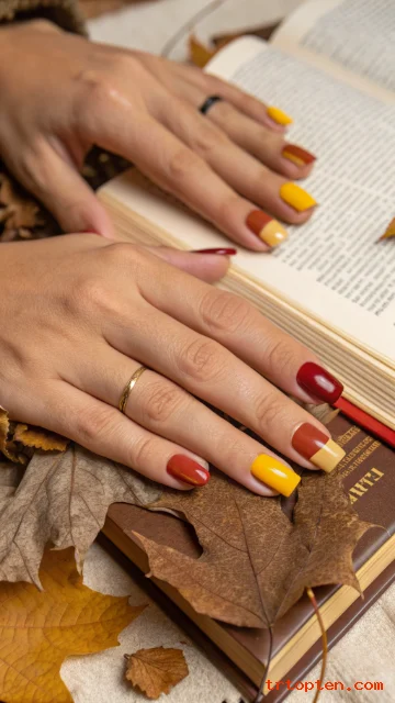 Choose a burnt rust orange and a rich mustard yellow polish. Divide each nail with diagonal or vertical sections and fill them with each color.