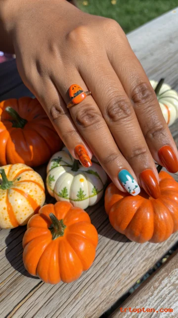 Use a sky-blue or soft beige base on a few nails to set the scene. Paint little orange pumpkins, green vines, and brown soil on accent nails.