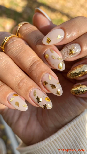 Gold foil leaf nails bring a touch of sparkle that still feels earthy and seasonal. The tiny flecks look like sunlit leaves scattered across your fingertips.