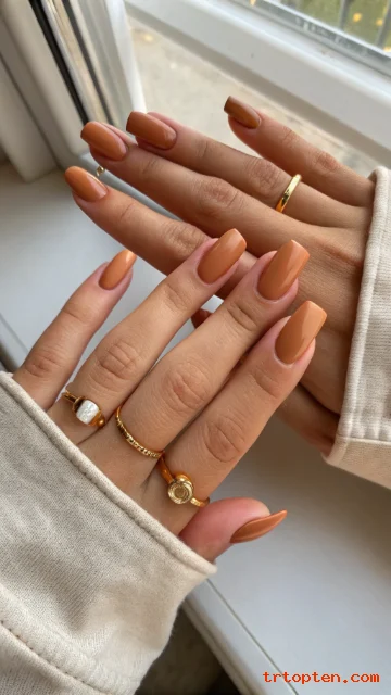 Terracotta nails give a grounded, earthy feel that suits every autumn outfit. The color sits between clay orange and muted brown.