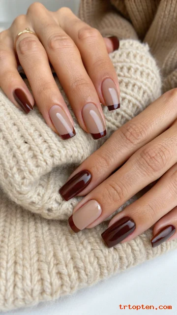 Start with a sheer pink or milky nude base that matches your skin tone. Replace the traditional white tip with a rich chocolate brown curve.