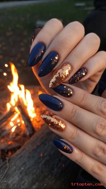 Use a deep navy or black base on all nails. Layer a fine gold or copper glitter topper, focusing more near the cuticles or tips to mimic flickering fire.