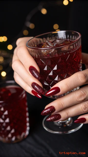 Use a deep cranberry or ruby base and top it with fine matching glitter. You can also pick a polish that already mixes pigment and micro glitter.
