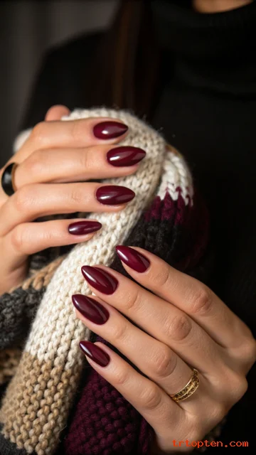 Deep wine and berry nails feel rich, moody, and perfect for cooler days. The color sits between red and purple, which flatters many skin tones.