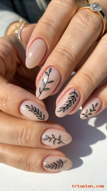 Paint nails in a sheer nude, soft pink, or pale beige. On one or two accent nails, draw fine black or dark brown outlines of small leaves near the tips or sides.