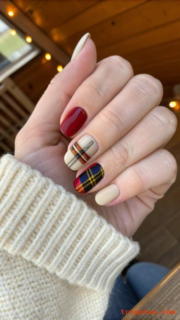 Choose a cream or soft beige base for most nails, then add plaid art on one or two fingers. Use shades like red, mustard, navy, and black for a classic flannel look.