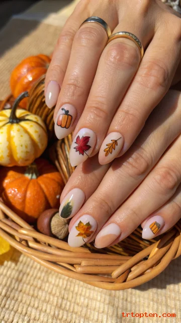 Start with a simple base color like nude, cream, or soft orange. Then apply tiny stickers of pumpkins, leaves, acorns, or wheat stalks on one or two nails per hand.