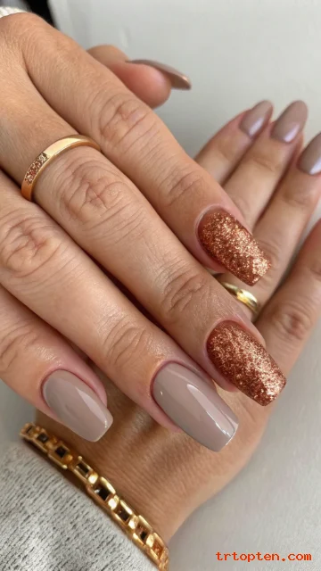 Neutral taupe nails with copper glitter accents give a balanced mix of calm and sparkle. The taupe keeps things grounded while the copper glows like fall sunsets.