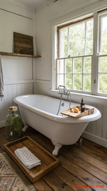 A classic clawfoot tub anchors a farmhouse bathroom. This tub style offers timeless vintage appeal. It provides a deep soak for ultimate relaxation. Position the tub under a window for lovely natural light. You can also place it centrally in a larger room