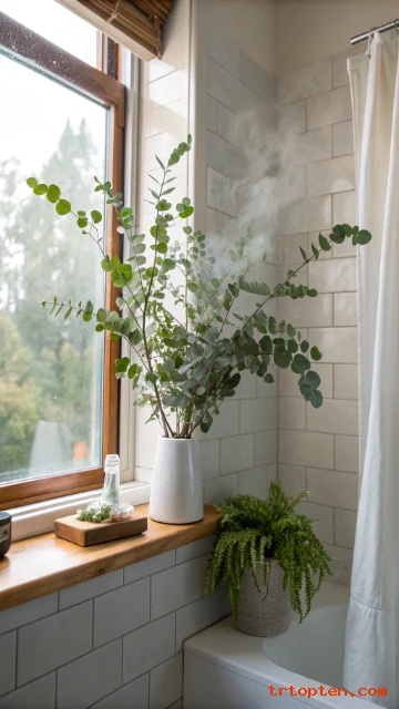 Bring the outdoors inside with simple greenery. Fresh eucalyptus in the shower releases a wonderful scent. Its scent is activated by steam from your shower. A small potted plant on the windowsill adds life.