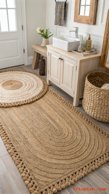 Choose a large size to anchor the main area. Layer a smaller washable rug on top by the sink. This layering trick adds depth and practicality. The natural fibers bring an earthy element indoors.
