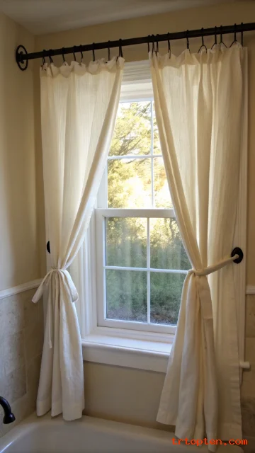 Dress your bathroom window for softness and privacy. Choose simple cotton or linen curtains. A neutral color like white, cream, or gray works best. Hang the curtains from a wrought iron rod. Use classic tie-backs or let them hang loose.