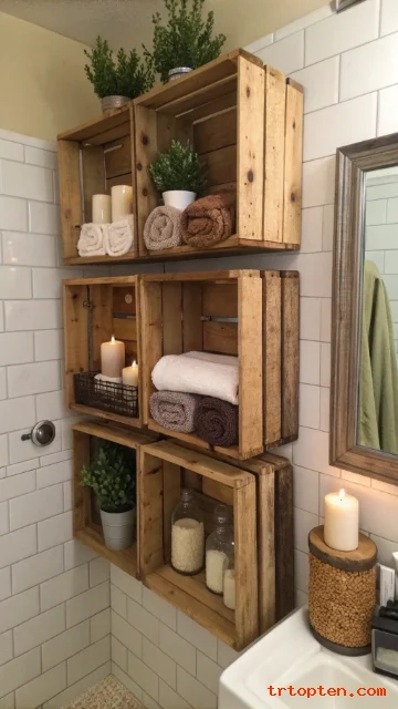 Mount wooden crates on your bathroom walls. This creates unique open shelving instantly. Use crates from a flea market or new ones. Sand and stain them to your preferred color. Arrange them in an asymmetrical grouping on a wall.