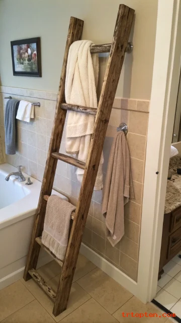 Repurpose an old wooden ladder for rustic charm. This is a clever and affordable DIY idea. The ladder leans against a wall securely. Use the rungs to hang multiple bath towels and robes. It provides ample drying space for a family.