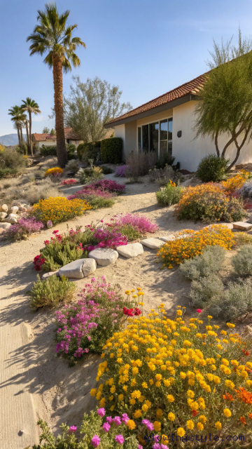 Desert flowers add bright color to the yard. They break the neutral tones. This makes the space lively.