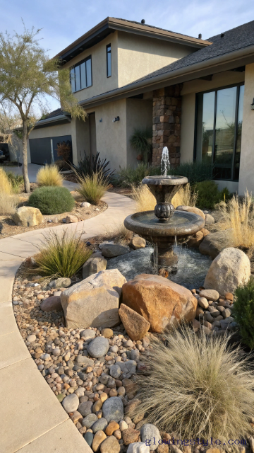 A small water feature adds contrast to a dry yard. It brings sound and movement. This makes the space feel lively.