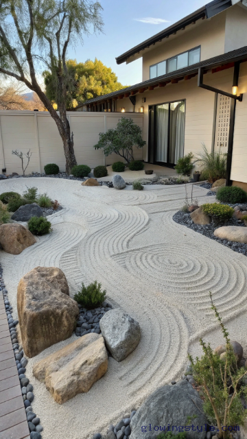 A Zen desert garden creates a calm and peaceful space. It uses sand, rocks, and minimal plants. The design stays simple.