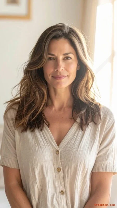 Long layers keep length while adding shape. Face-framing pieces brighten your look near the cheeks. This option suits many face shapes and hair types.