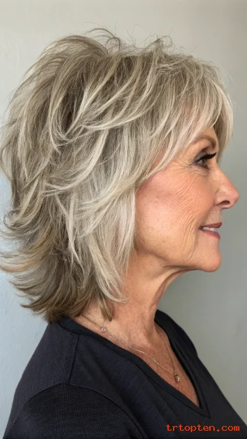 This hairstyle works well for fine to medium hair and can make thin strands look fuller. It also pairs beautifully with gray or silver tones, because the layers catch the light.