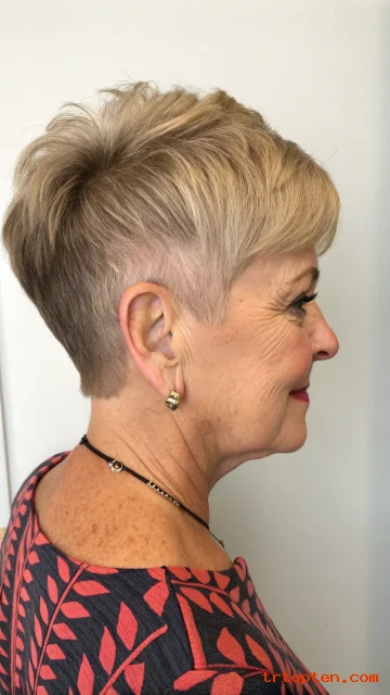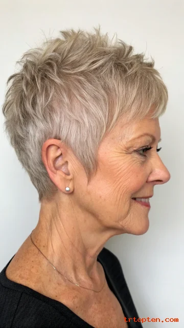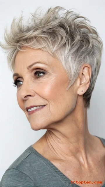 If you color your hair, this style uses less product and grows out fast. If you embrace gray, the short cut often makes the silver look bright and stylish.