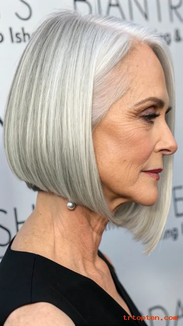A silver blunt bob showcases natural gray or white hair in a bold way. The straight edge draws attention to the color and shine.