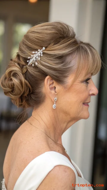 Women over 60 often prefer soft, loose updos instead of tight, severe ones. A few wisps around the face keep the style gentle.