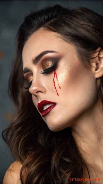Bloody tears makeup looks dramatic and still lets you stay very glamorous. Do a full glam look with flawless foundation, sculpted cheeks, and shimmery eyeshadow.