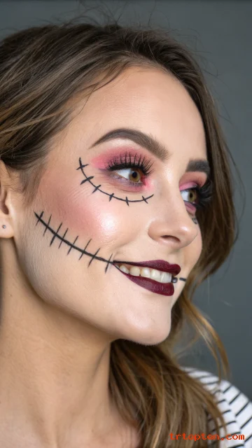 You can extend stitches up from the corners of the mouth toward the ears for extra drama. Pair with rosy blush and glossy eyes to keep that unsettling cute doll effect.