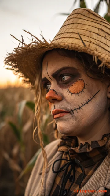 A scarecrow look can be cute or deeply creepy depending on details. Start with warm bronzed skin and heavy blush on the nose and cheeks to mimic sun exposure.