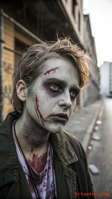 Use liquid latex or tissue and glue to build torn skin textures on the cheeks or forehead if you like gore. Finish with fake blood around the mouth and on the neck so you look fresh from the apocalypse.
