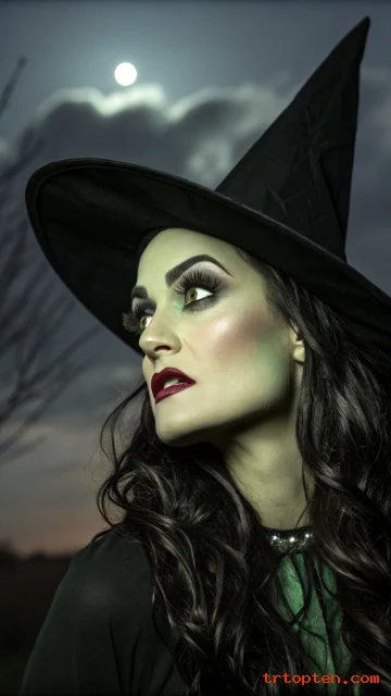 A glamorous witch look blends classic green or pale skin with fierce contour and eyes. Decide if you want a green tint by mixing green face paint with foundation or keep a ghostly pale base.