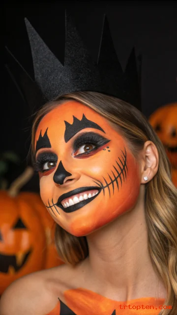 Turn your face into a glowing jack-o’-lantern with a soft glam twist. Use orange face paint or eyeshadow across your cheeks and forehead, then deepen the edges with a darker burnt orange or brown for depth.